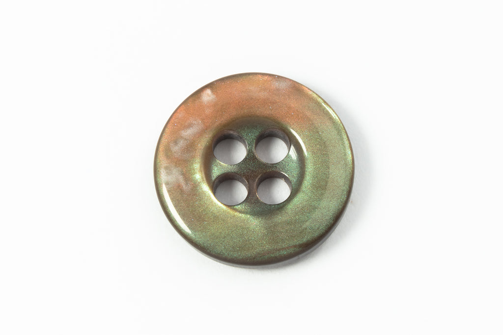 13mm button with four holes and wide raised border.