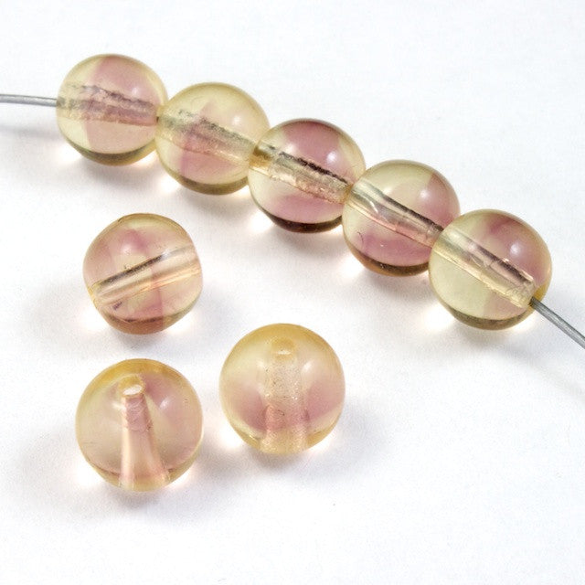 6mm round glass bead in jonquil yellow and light amethyst two tone.