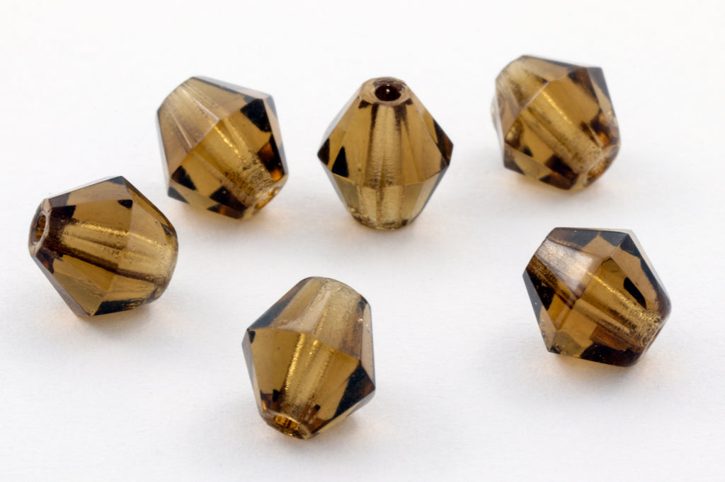 6mm faceted glass bicone bead in transparent smoked topaz.