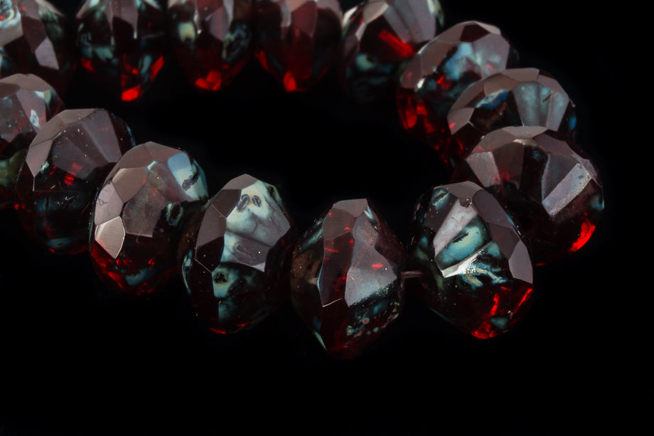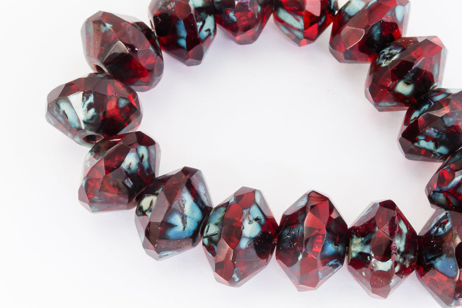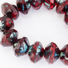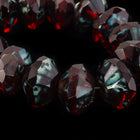 Glass bead. 7mm x 11mm transparent ruby faceted saucer bead with picasso finish.