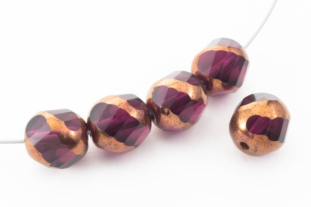 8mm pressed glass swirl bead in transparent amethyst with metallic bronze accent.