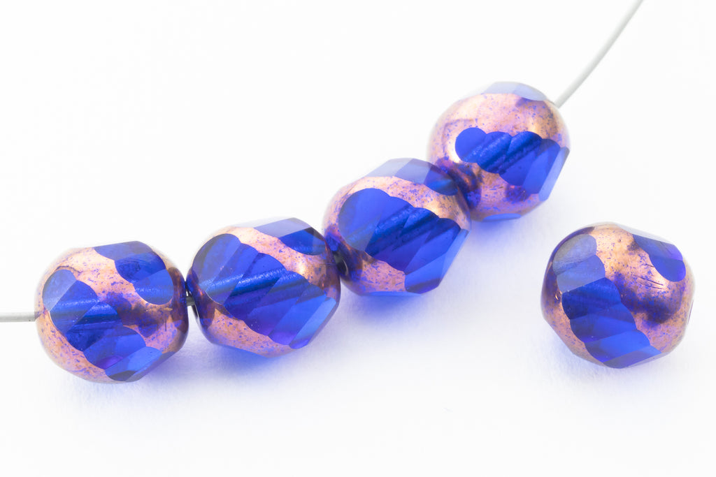 8mm pressed glass swirl bead in transparent amethyst with metallic bronze accent.