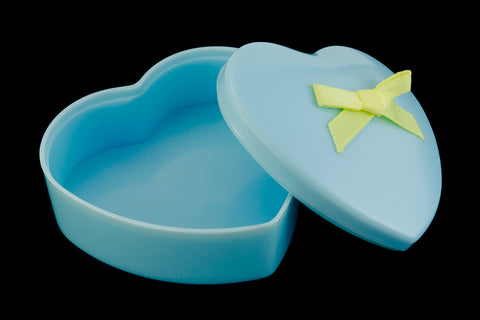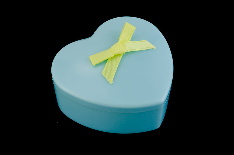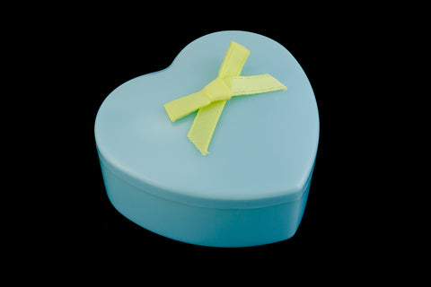 2 1/2 inch x 2 3/8 inch x 1 inch pastel blue heart shaped plastic gift box with yellow ribbon tied in a bow.Made in the USA circa 1960's.