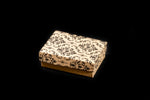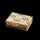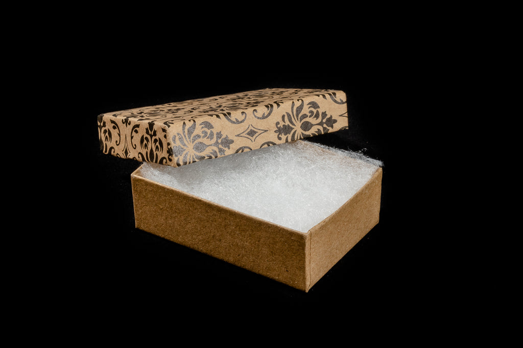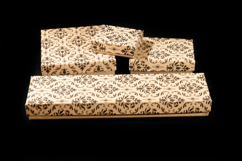 3 ¼” x 2 ¼” x 1” beige gift box with lovely black floral Damask pattern on the lid.