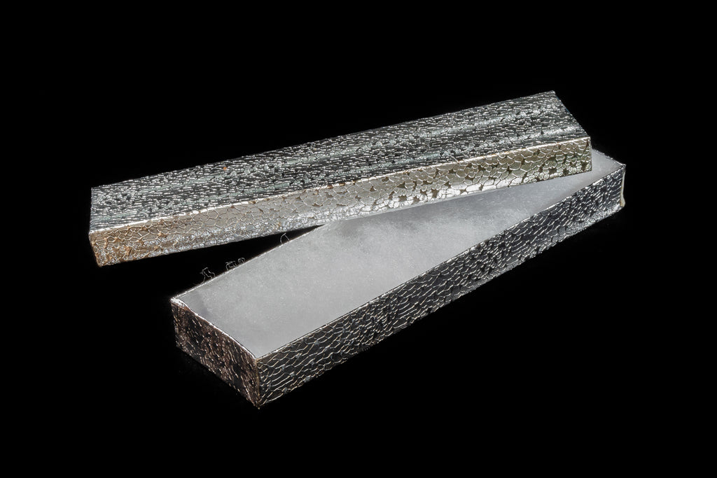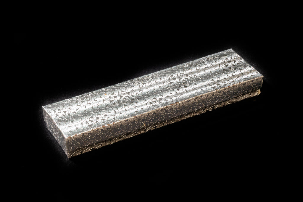 8” x 2” x 1” metallic silver gift box with textured surface.