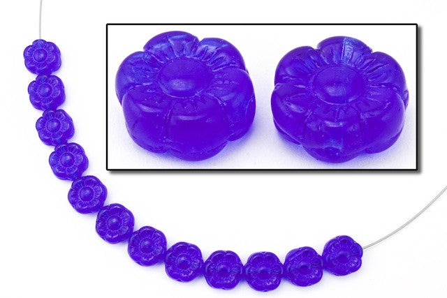 10mm sapphire blue pressed glass flower bead with 6 petals.