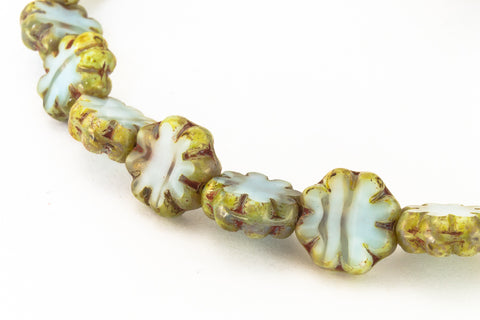 9mm cactus flower beads in striped opaque sky blue with Picasso finish on sides.