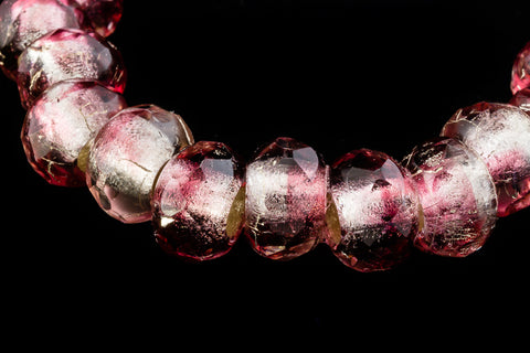 6mm x 9mm glass rondelle with faceted edge in silver lined swirled fuchsia and crystal.