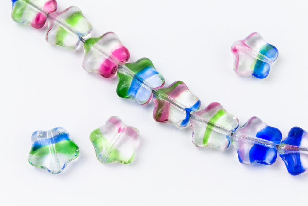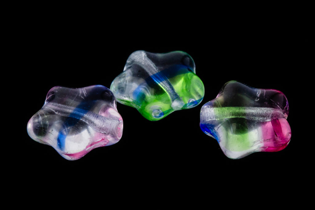 "Art glass" style- crystal clear with pink, green and blue swirls.