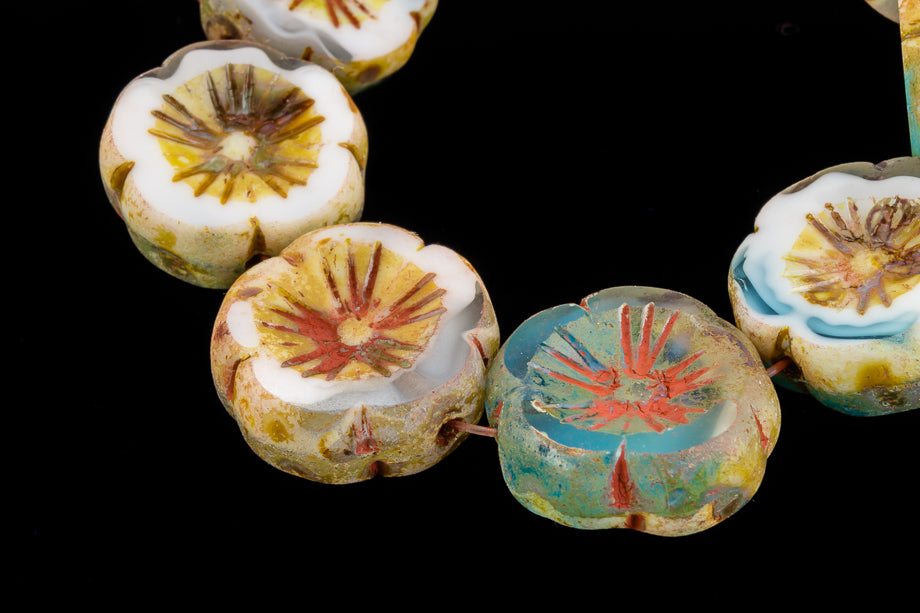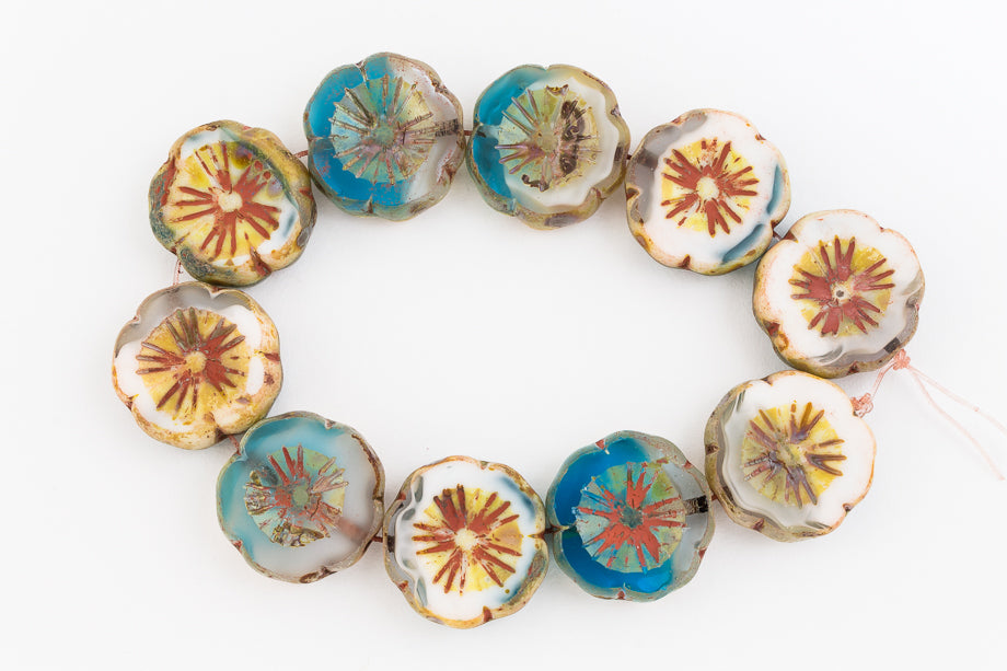 14mm marbled transparent Capri blue and opaque white flower shaped bead with Picasso finish.