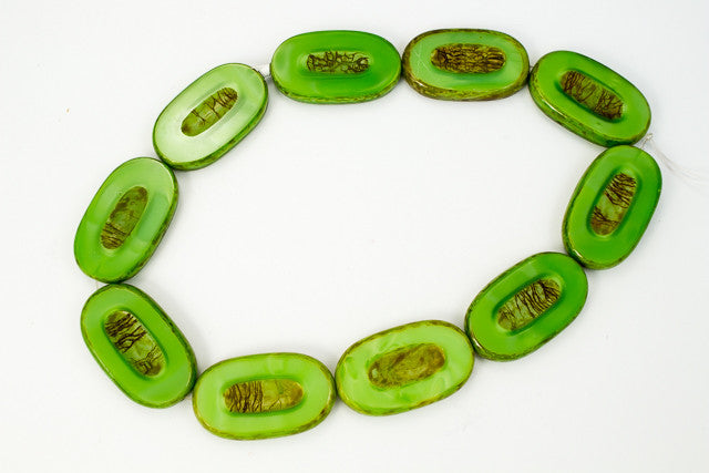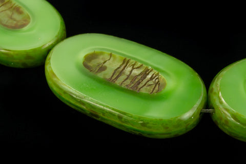 15mm x 26mm bright mantis green flat oval bead with carved center detail and picasso finish.