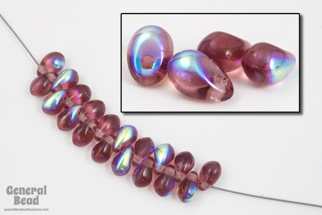 4mm x 6mm transparent amethyst glass teardrop bead with iridescent coating on one side and hole through top.