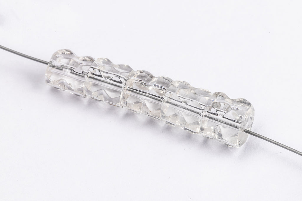 6.76mm x 7.38mm transparent crystal faceted barrel with lengthwise hole.