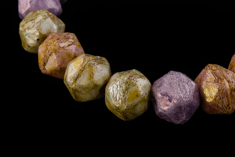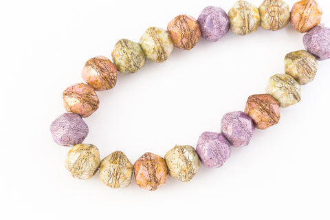 8mm mix of opaque ivory, lavender and soft coral "English cut" glass faceted bead with dull wash.