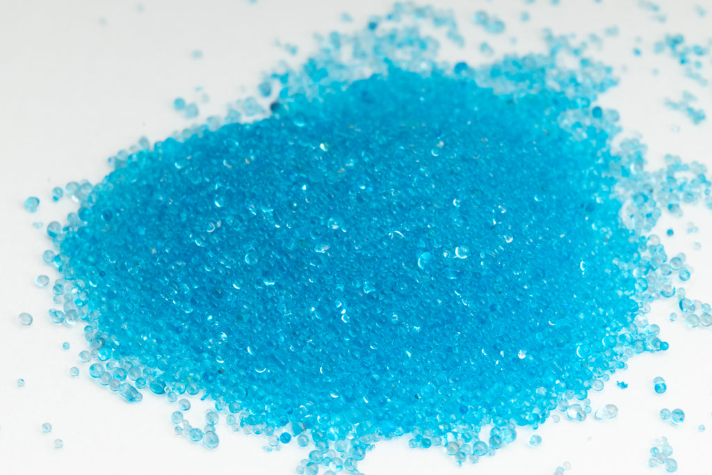 Very fine no hole glass microbeads in transparent sky blue.