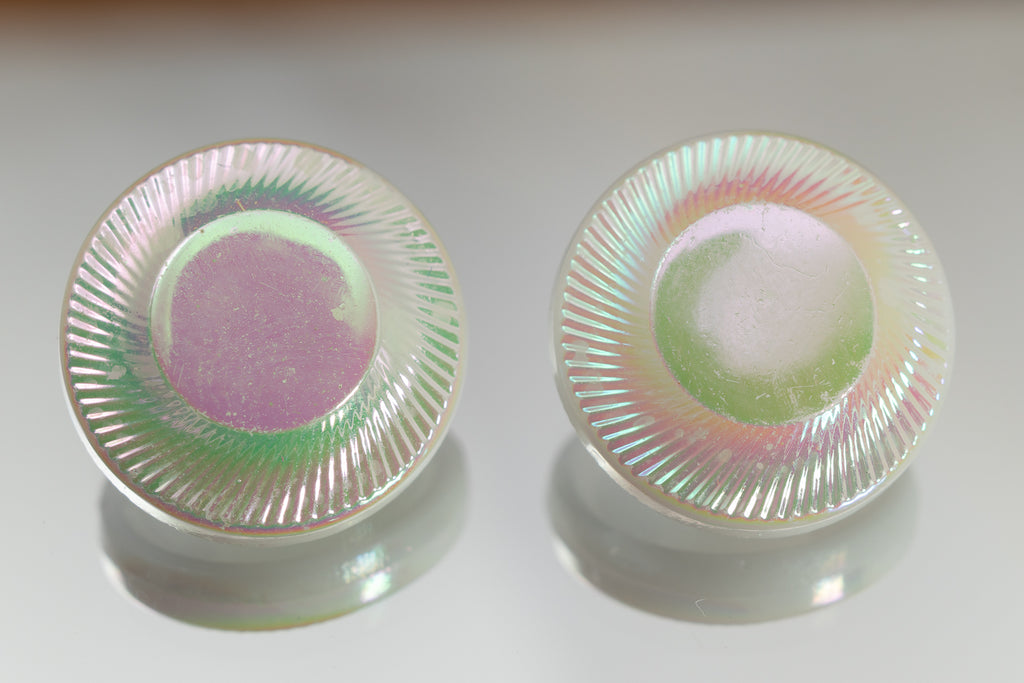 13.32mm white glass button with iridescent sheen and molded shank on back.6.7mm wide at shank.