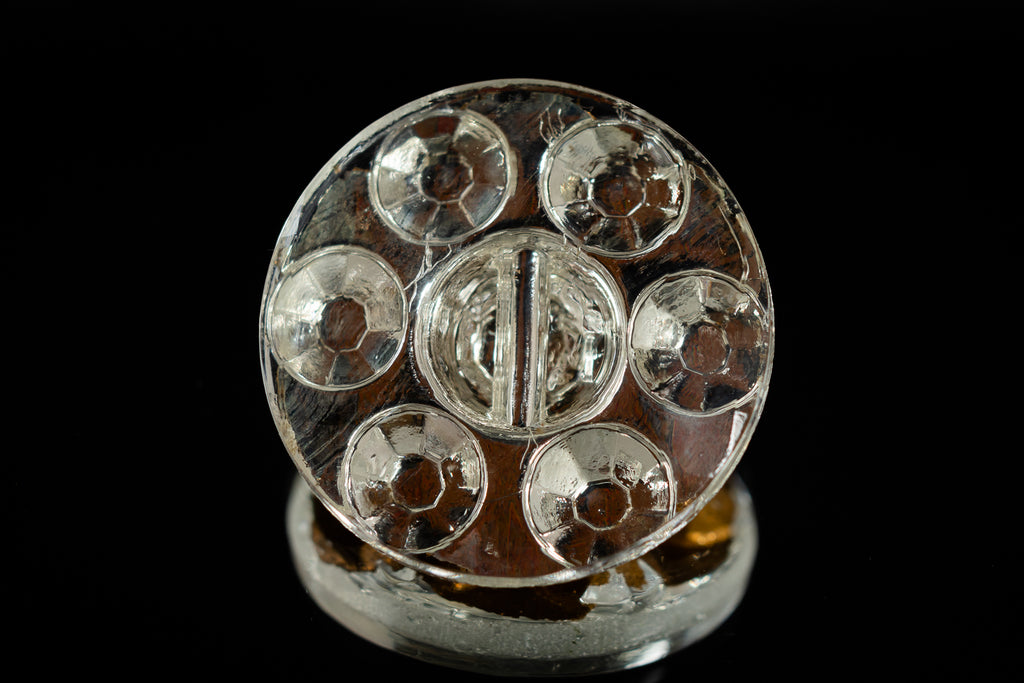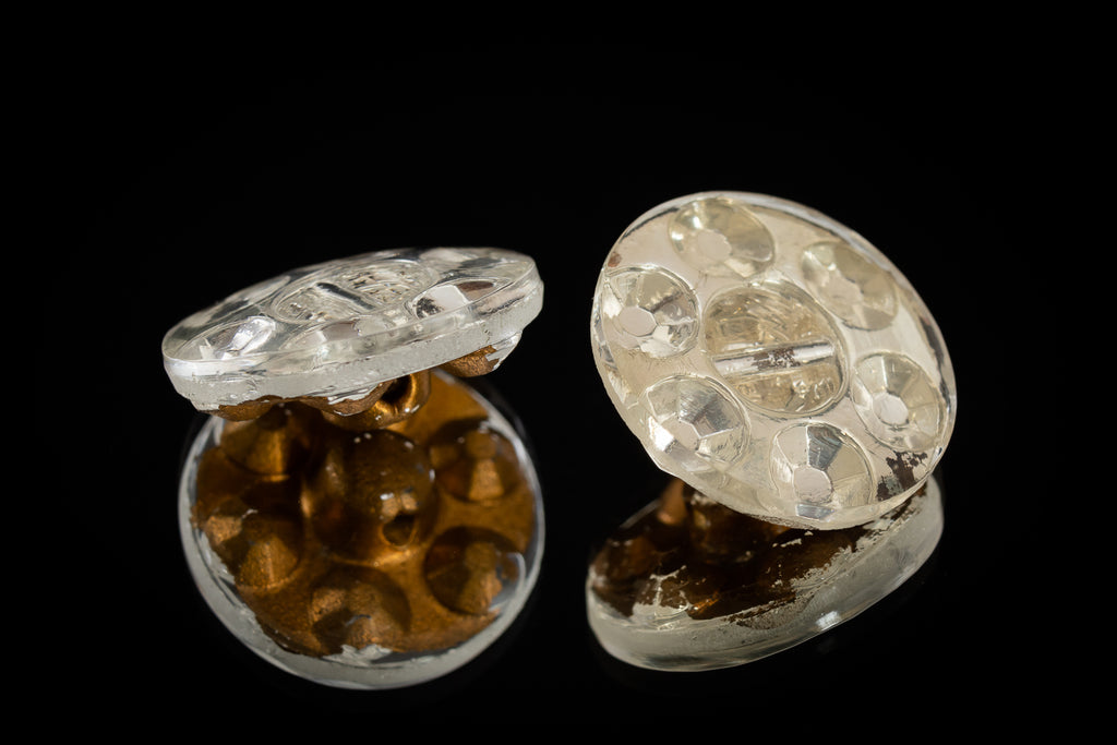 18.18mm crystal flat glass button with gold foil and molded shank on back.