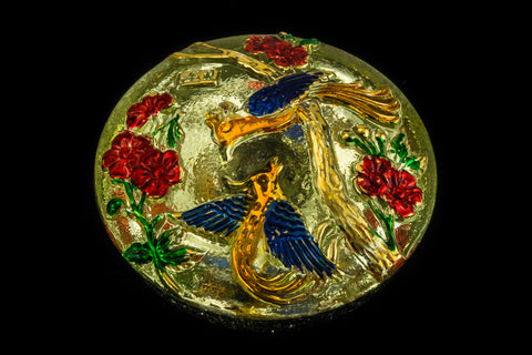 25mm light gold domed glass button with detailed blue and gold birds on branch and red flower clusters.