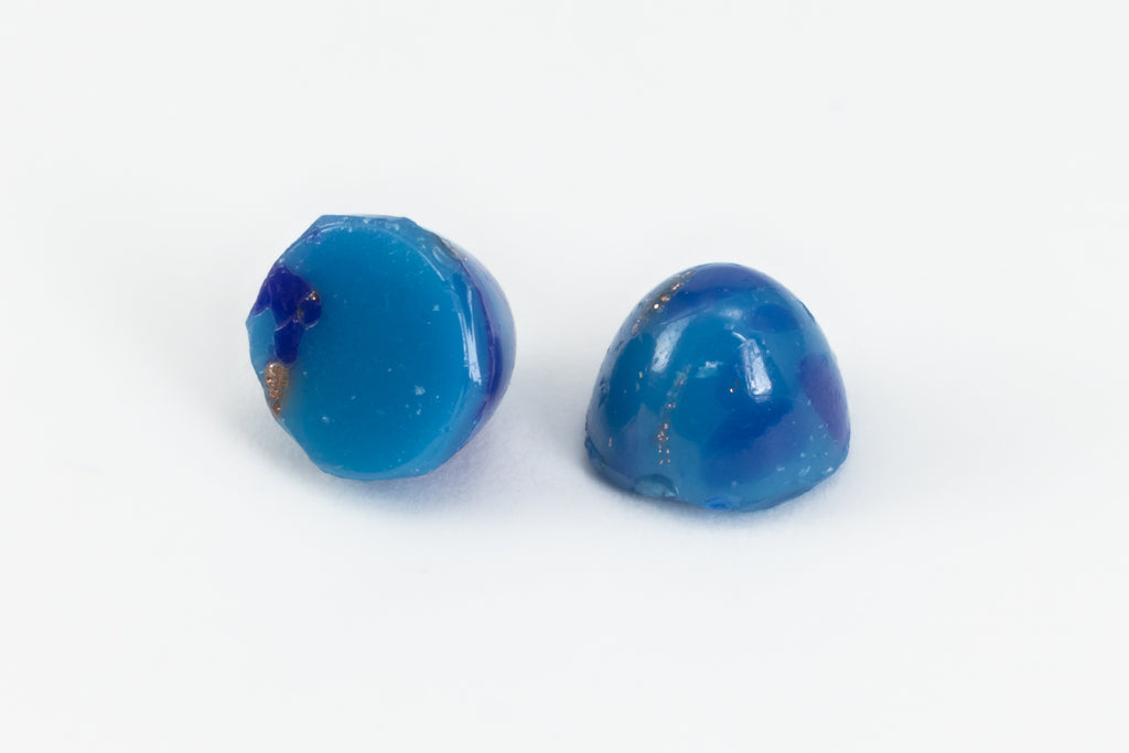 Opaque blue marbled with darker blue and flecked with metallic gold.Made in Germany or the Czech Republic in the 1960's or earlier.2 pieces per package.