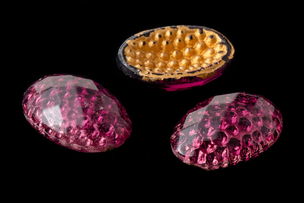 Amethyst with gold foil. Edges may be irregular.Made in Germany or the Czech Republic in the 1960's or earlier.Sold individually.