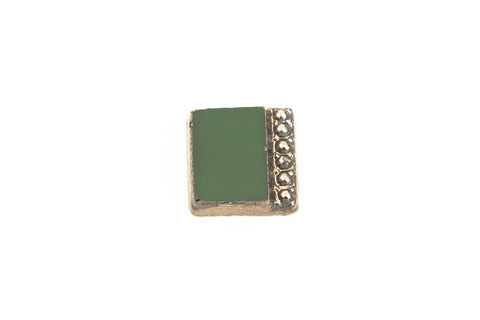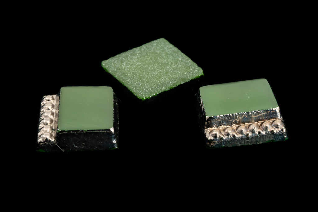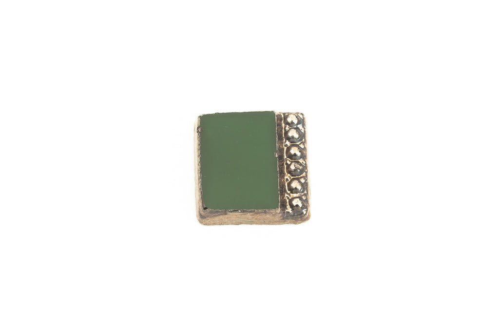 6.84mm x 7mm opaque olive green square flat back.One side has lowered edge with beaded border and gunmetal coating.