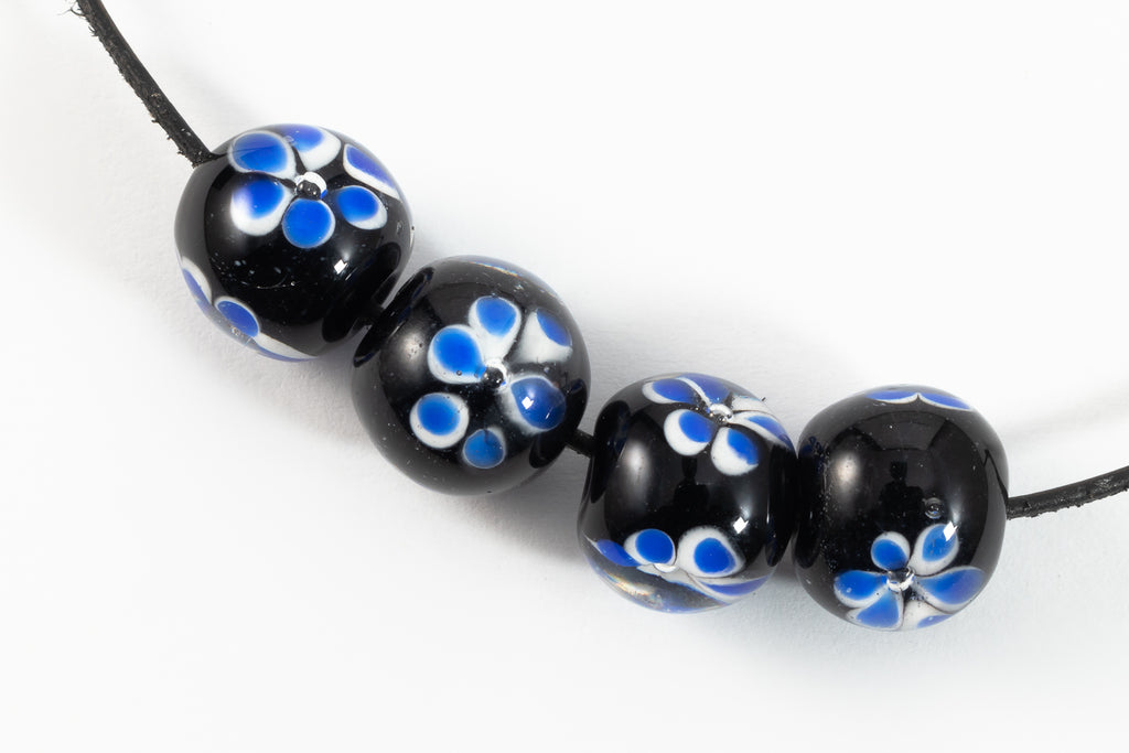 Black background with blue and white flowers. 1.5mm to 2.5mm hole.