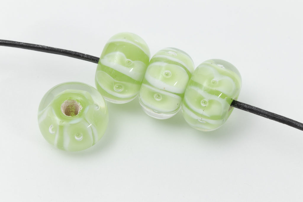 7mm x 12mm glass rondelle bead with lime green and white design.