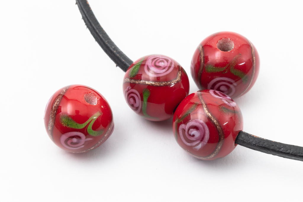 12mm Red with Pink Flowers Lampwork Bead (2 Pcs) #LCB041