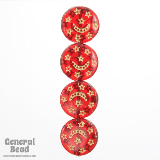 12mm transparent ruby flat round disk with gold crescent moon and star design.