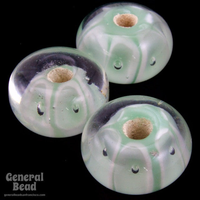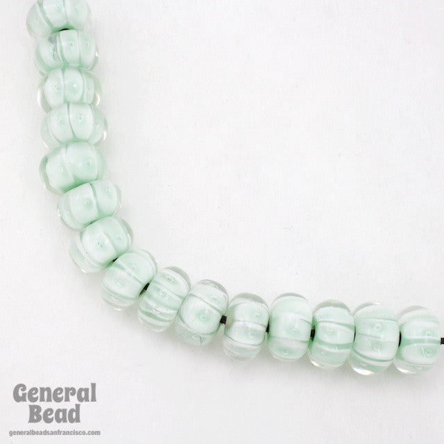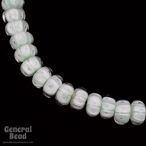 7mm x 12mm glass rondelle bead with sea green and white design.