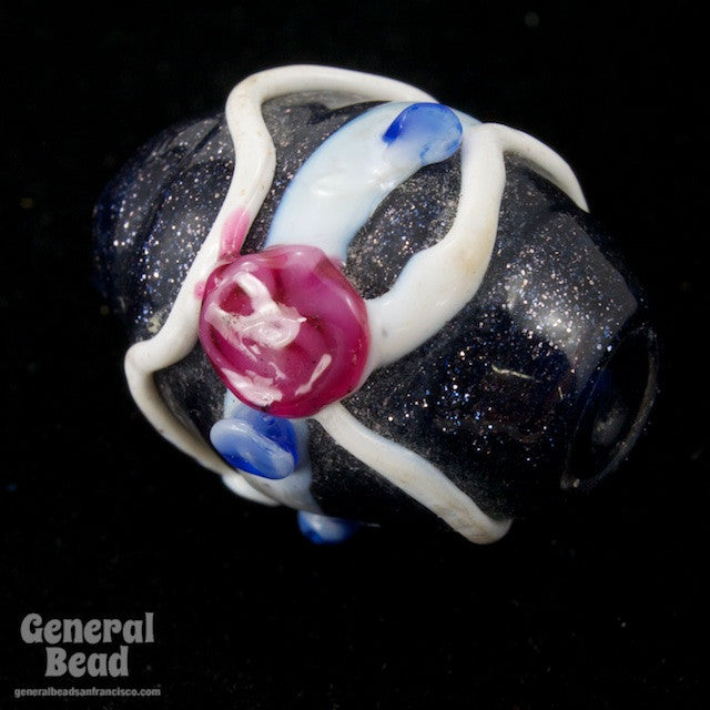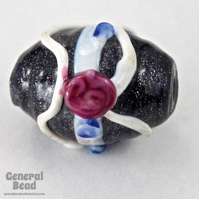 13mm x 18mm opaque black oval with white decoration and pink flower.