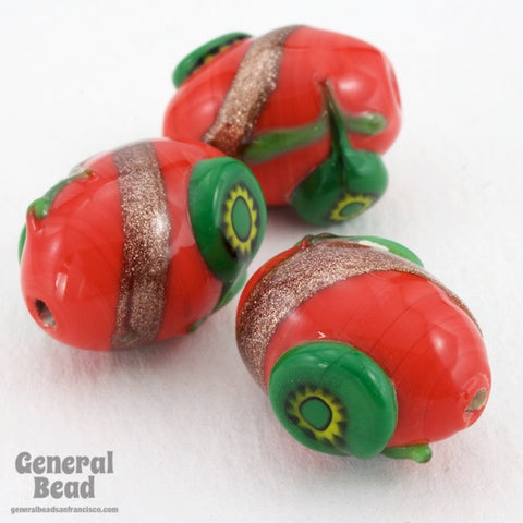 13mm x 18mm opaque red oval with sparkling bronze swirl and green motif.