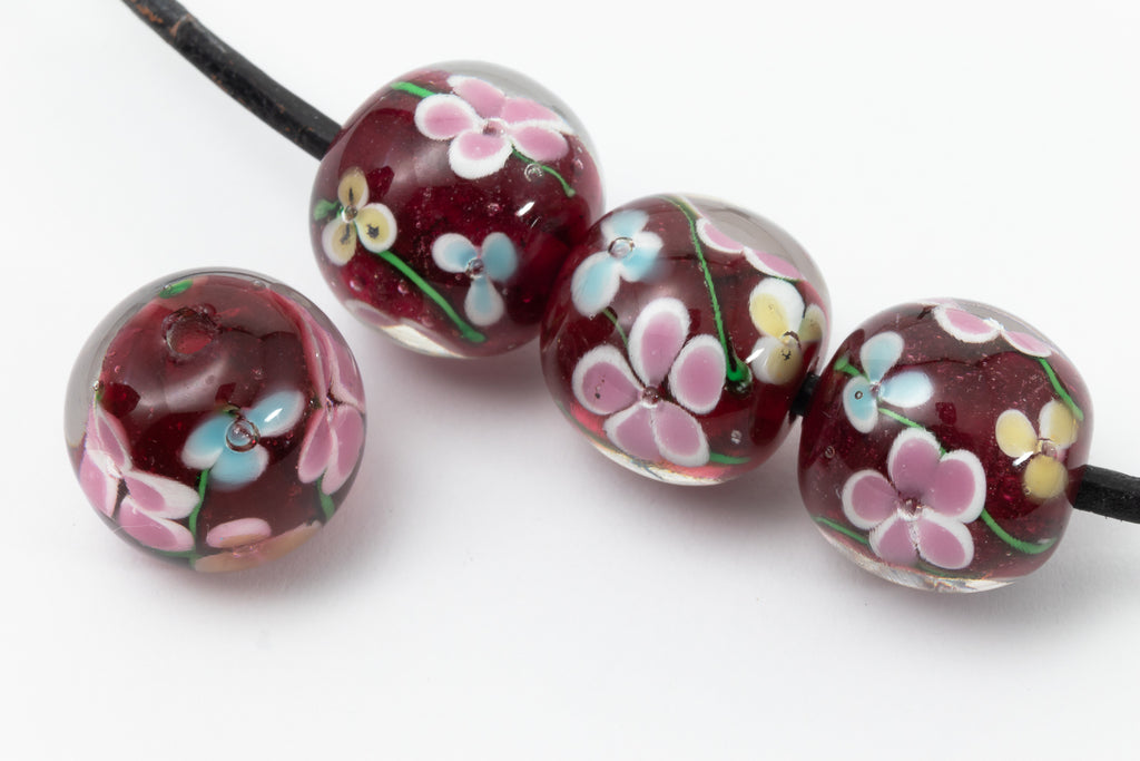 16mm Dark Red Lampwork Round Bead with Pastel Flowers #LCG001