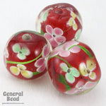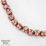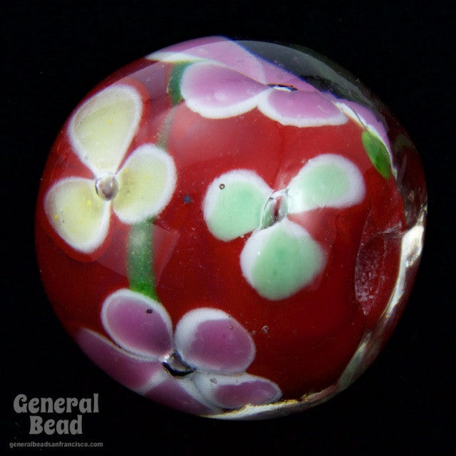 16mm round bright red with pink, yellow and blue pastel flowers.