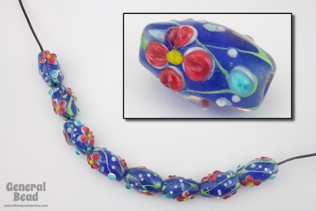 10mm x 18mm sapphire lampwork barrel with dimensional pink flowers.