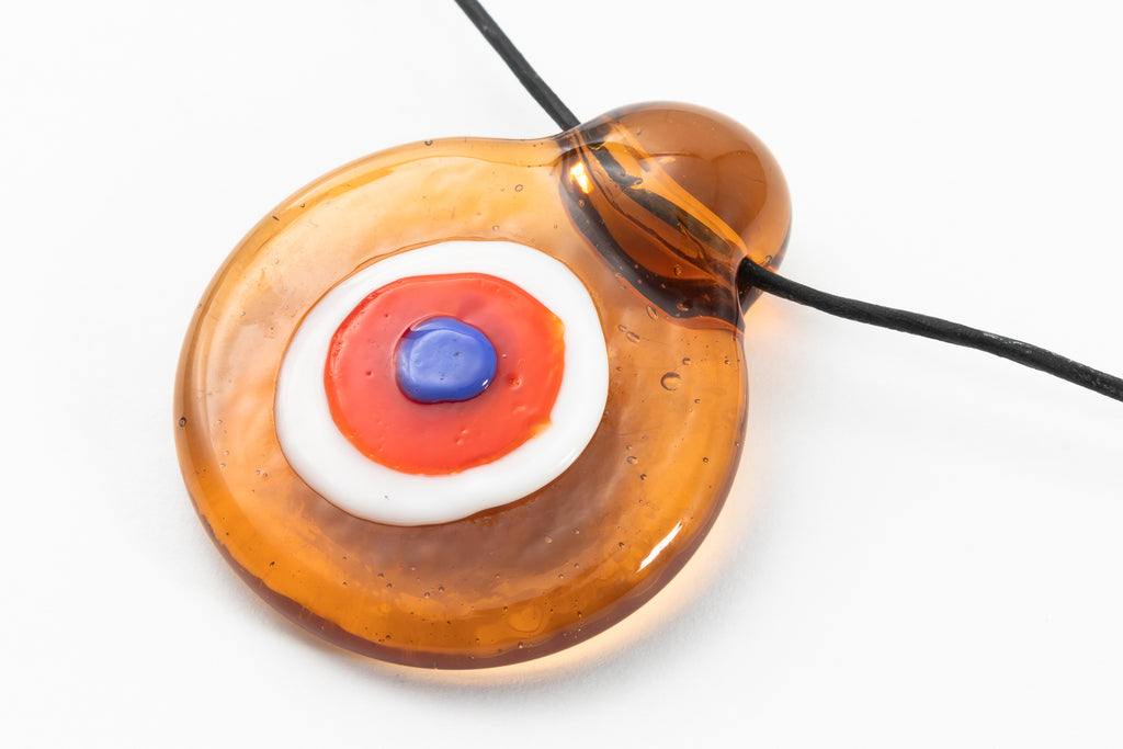 30mm Evil Eye glass pendant.Transparent dark topaz with white, red and blue. Sideways hole at top measures about 1mm. Made in China in the 1990's.1 or 6 pieces per package.