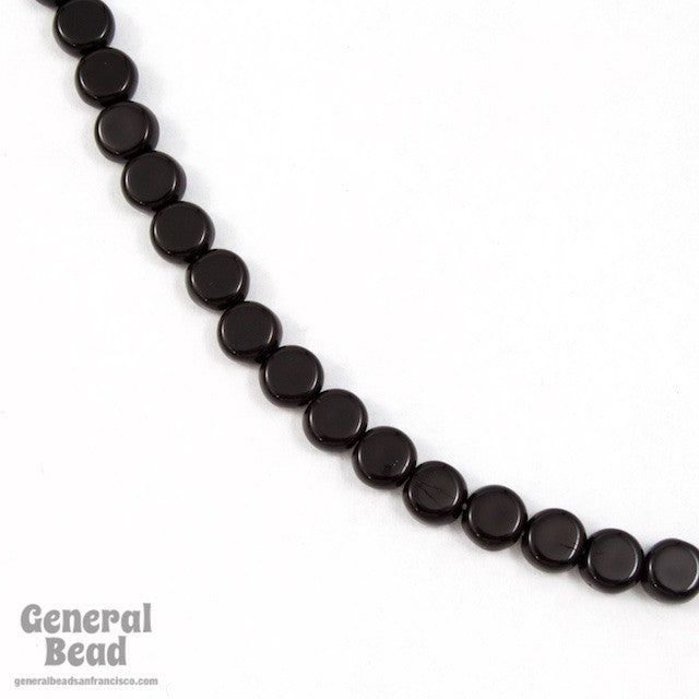 4mm opaque black glass flat disc bead with hole through side. Made in the Czech Republic circa 1980's. 100 pieces per package.
