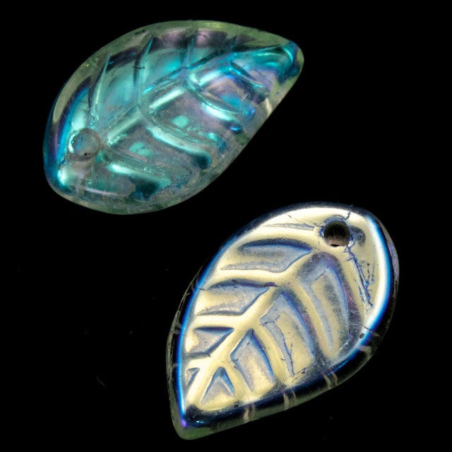 8mm x 12mm transparent iridescent peridot leaf pendant with hole at top.