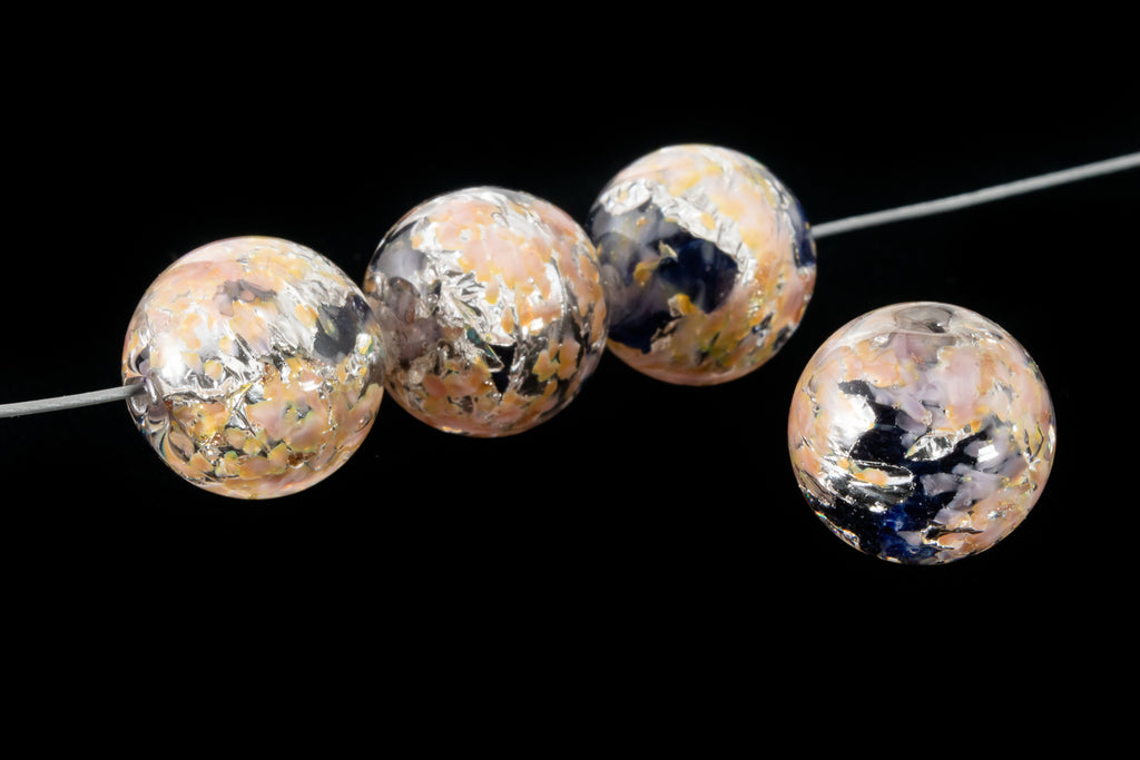 Silver foil with peach specks on black glass under a clear outer layer.