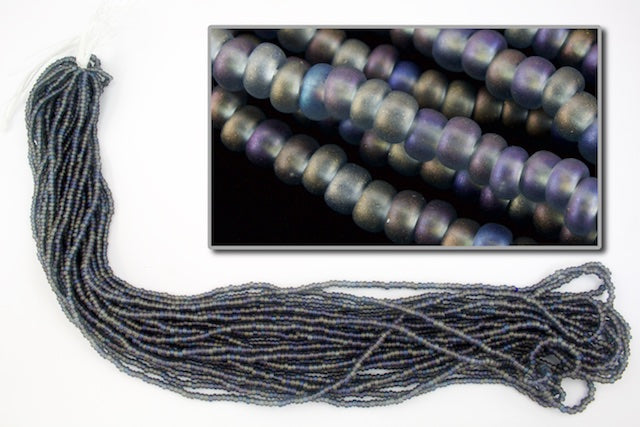 Size 8 matte iridescent black diamond seed bead.