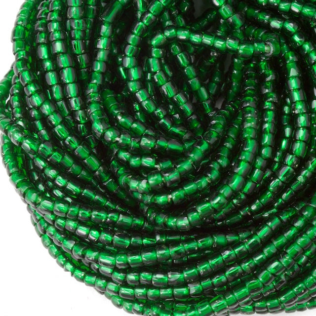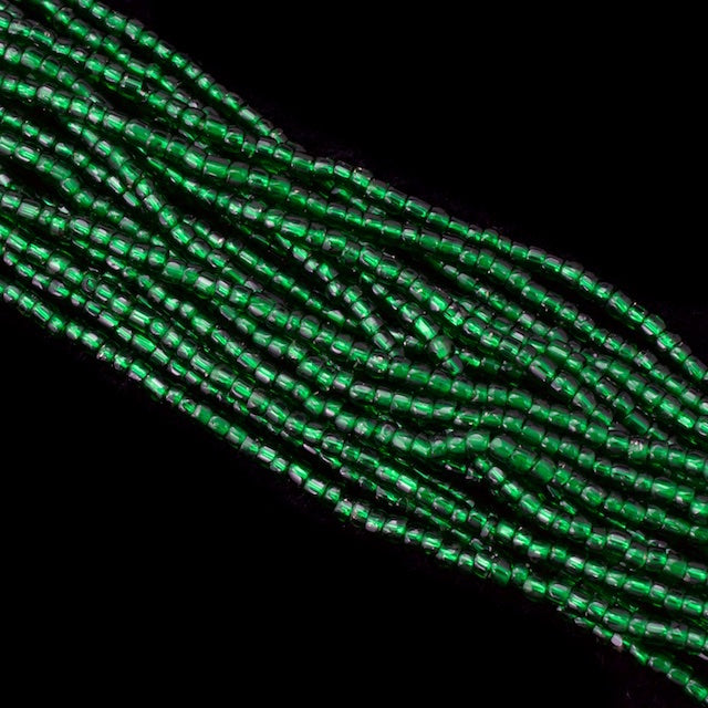 Size 12/0 (1.7mm) 3-cut glass seed bead in silver lined emerald.