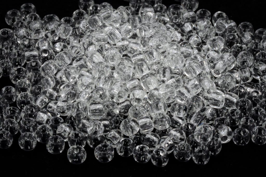 Size 8 transparent seed bead with glow-in-the-dark effect.