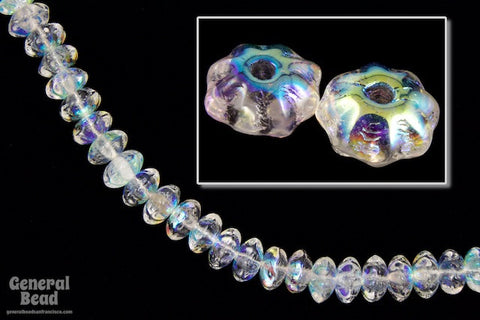 3mm x 6mm flower shape rondelle in transparent crystal with iridescent sheen.