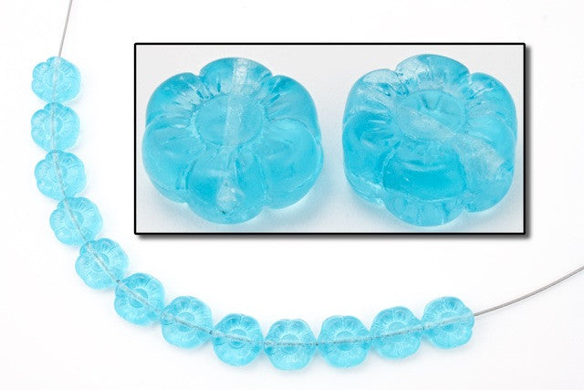 10mm aqua blue pressed glass flower bead with 6 petals.