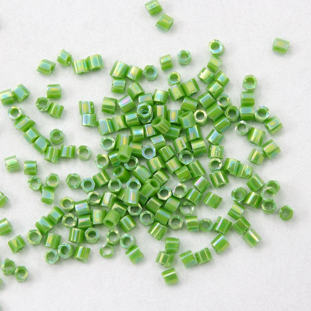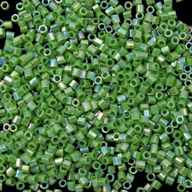 1mm x 1.4mm size 15/0 opaque pea green hex seed bead with AB finish.