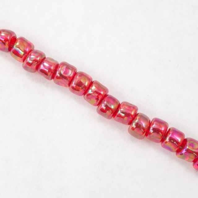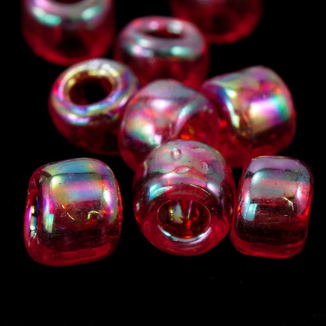 Size 3/0 (5mm) transparent red seed beads with AB finish and 2mm hole.