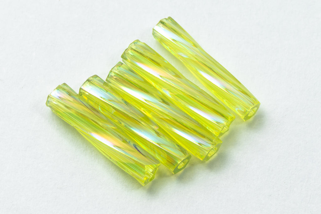 Size 4 twisted bugle in transparent chartreuse aurora borealis.