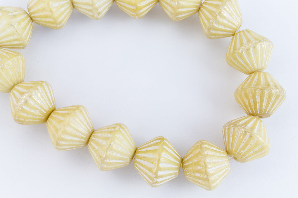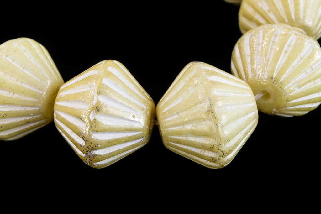 11mm glass bicone bead in opaque ivory with light cream grooves.
