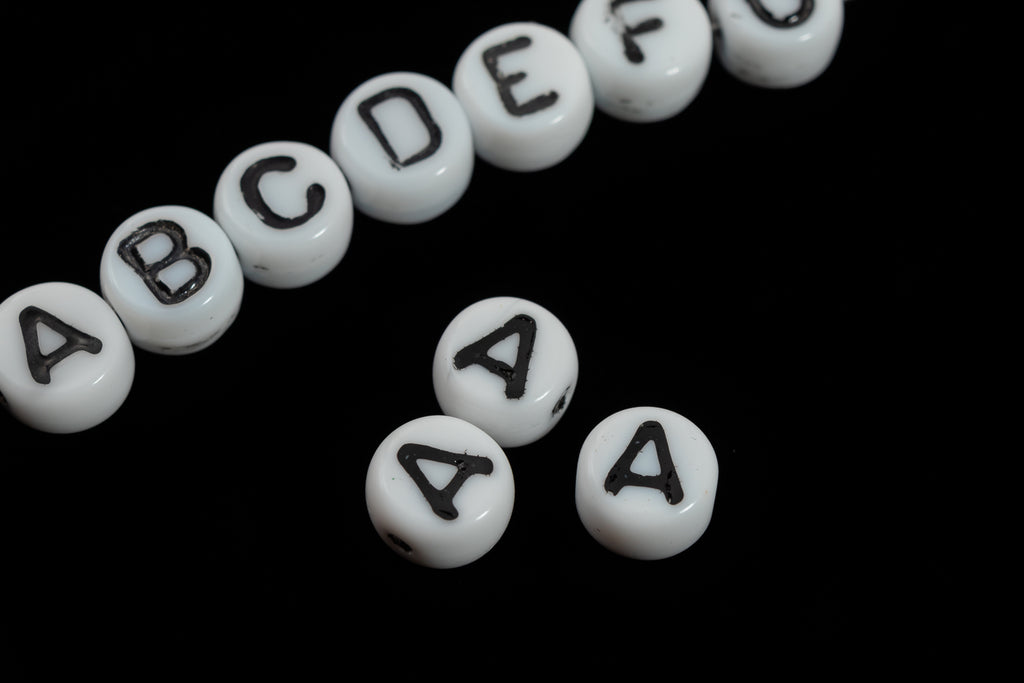 6mm x 4.25mm white glass flat oval beads with black letter "A" on both sides and 1mm sideways hole.