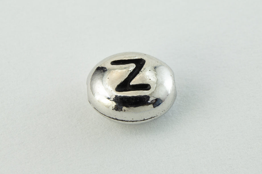 6mm x 5mm antique silver bead with inscribed capital Roman letter "Z" and lengthwise hole.